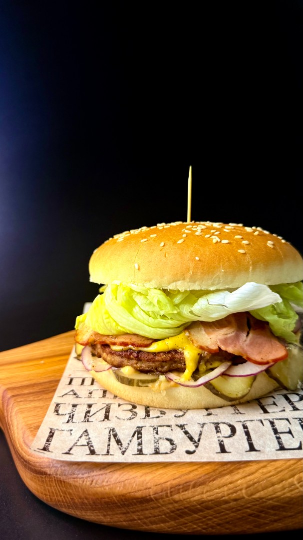 Котлета говяжья, бекон жареный, салат айсберг, сыр чеддер, маринованные огурчики, лук красный, соус гриль, булочка с кунжутом. вес: 280 грамм