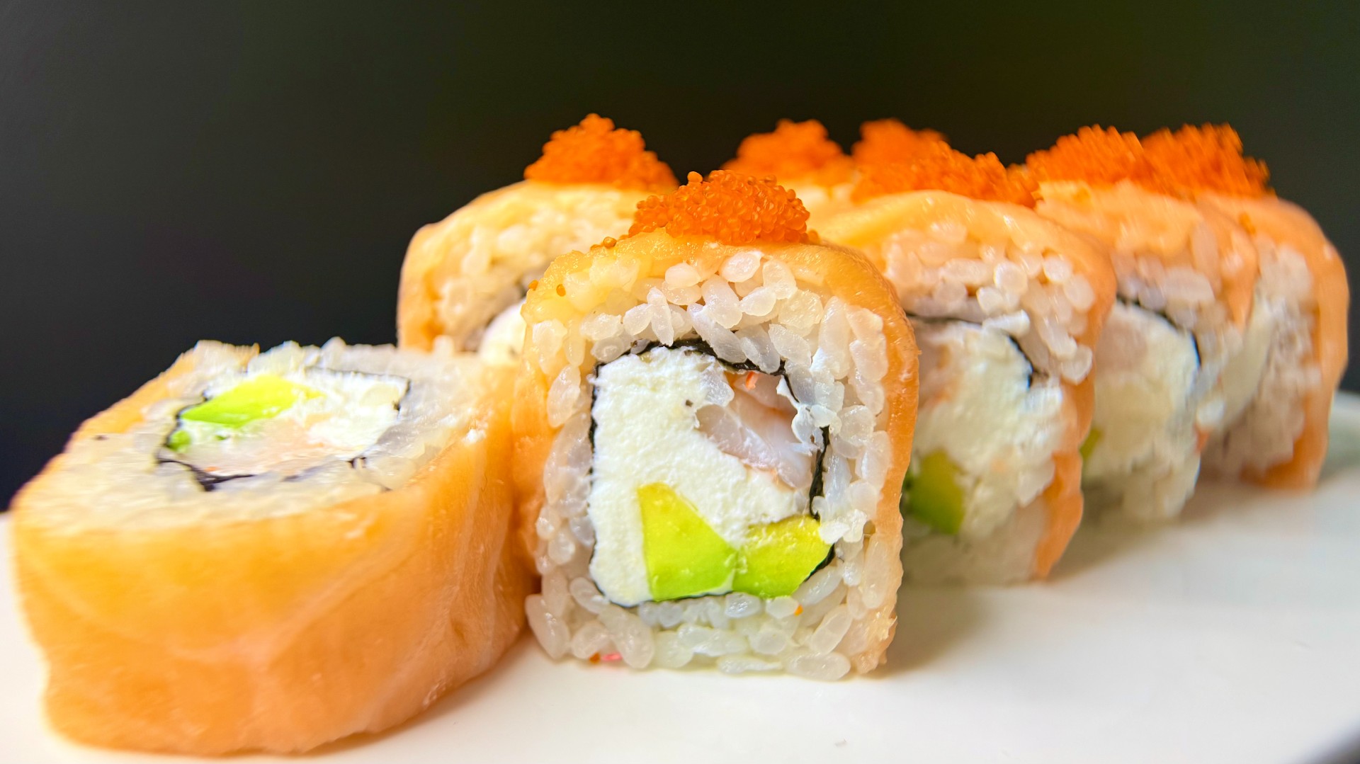 Лосось охлажденный, креветка тигровая, сыр творожный крем-чиз, авокадо, сверху: икра масаго. вес: 244 гр.