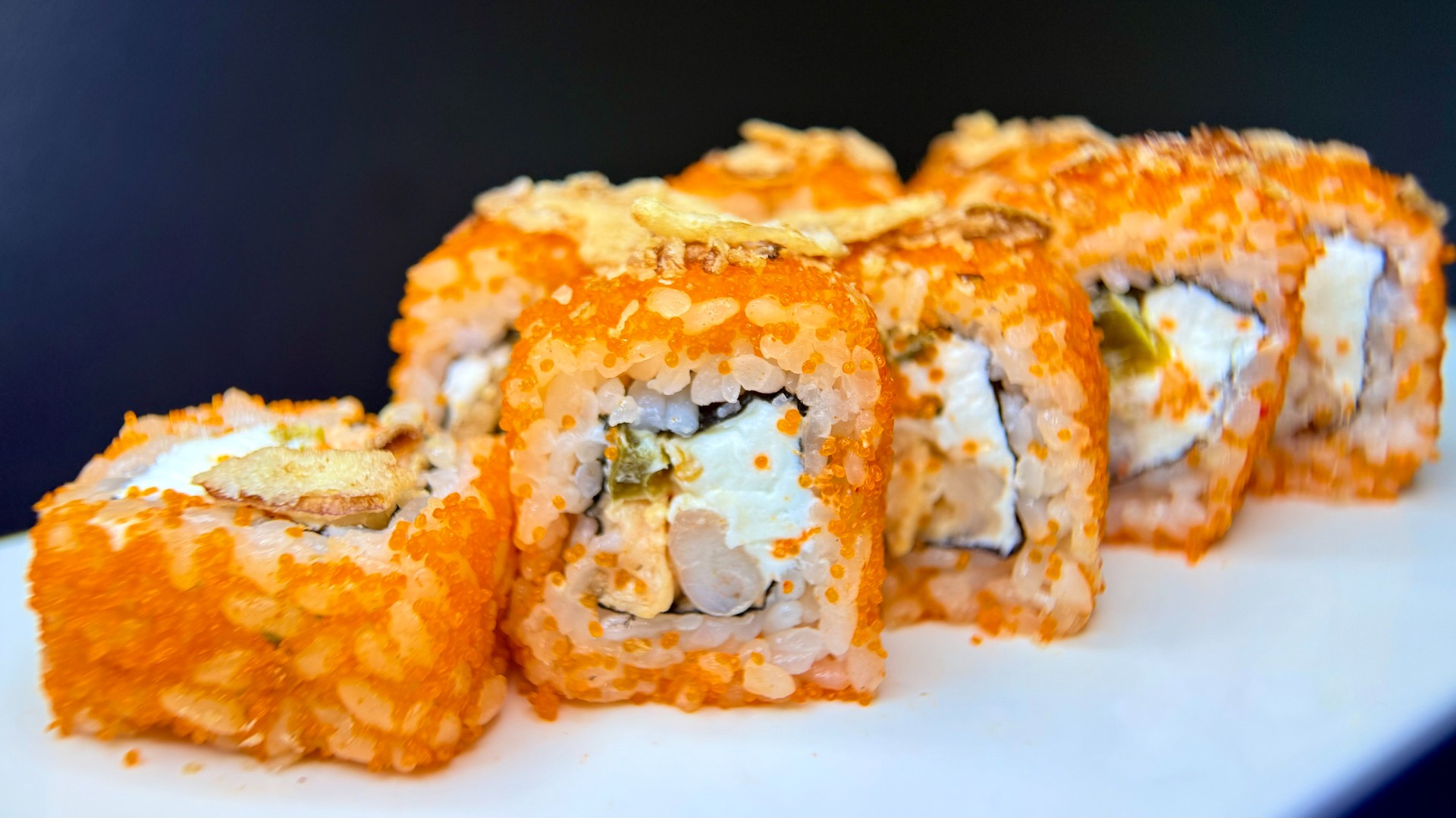 Креветка тигровая, лосось жареный в остром соусе, сыр творожный крем-чиз, халапеньо, икра масаго, сверху: лук фри. вес: 236 гр.