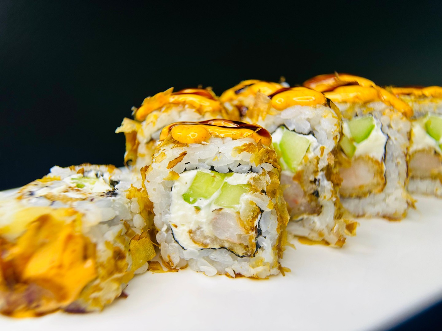 креветка в кляре, сыр творожный крем-чиз, огурец свежий, стружка тунца, сверху: соус спайси, соус унаги. вес: 210 грамм