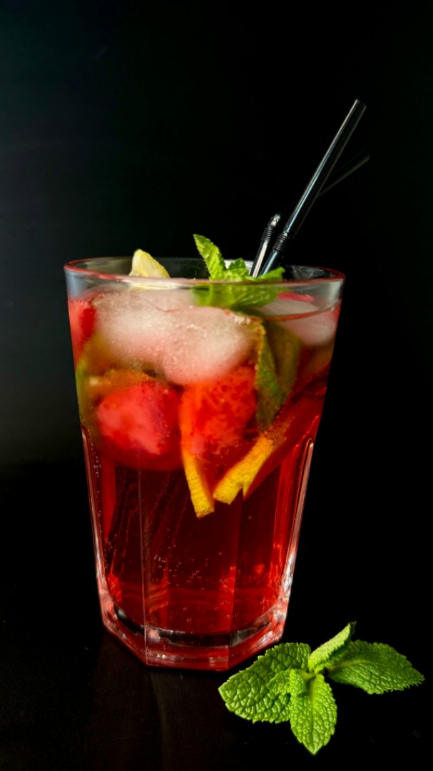 ТОЛЬКО ДЛЯ ПРИОБРЕТЕНИЯ В КАФЕ Состав: Мята, Клубника, Лимон, Сироп клубничный, Сироп мохито, Газ.вода,Лед