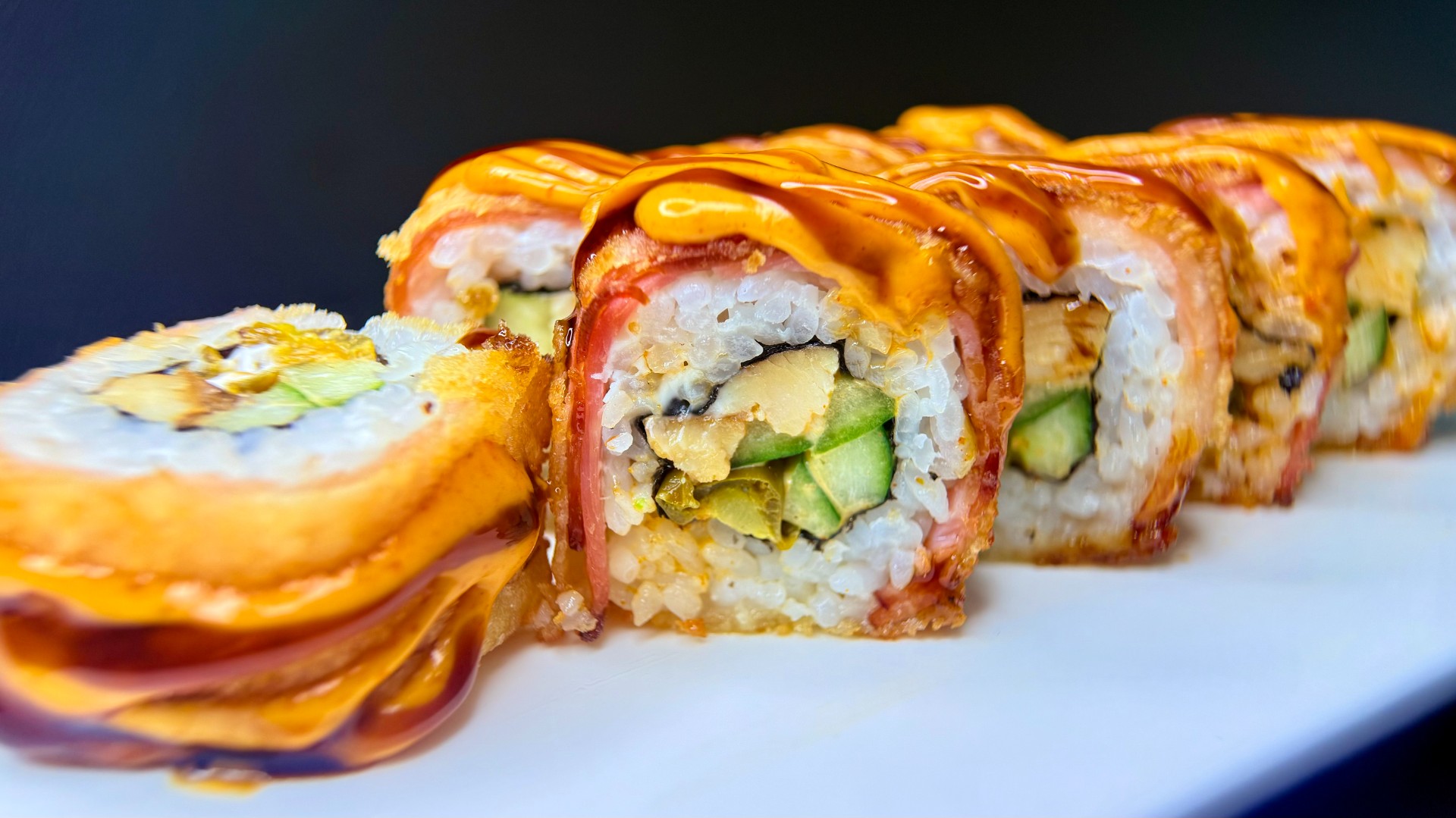 кура жареная, огурец свежий, майонез, халапеньо. сверху: бекон, кляр, сухари панировочные, соус унаги, соус спайси вес: 270 грамм
