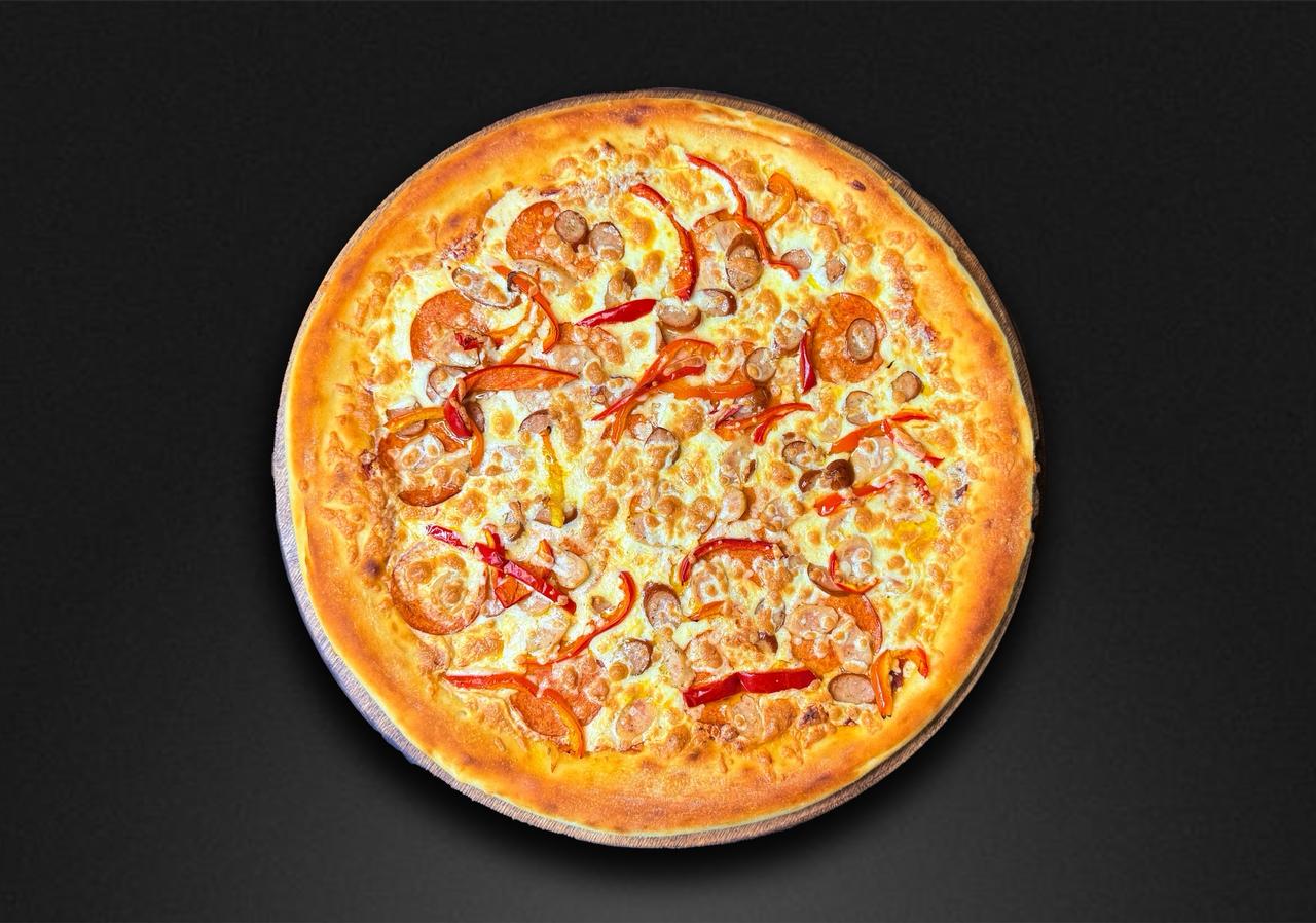 Соус барбекю, сыр моцарелла, пепперони, колбаски куриные, колбаски свиные, болгарский перец.