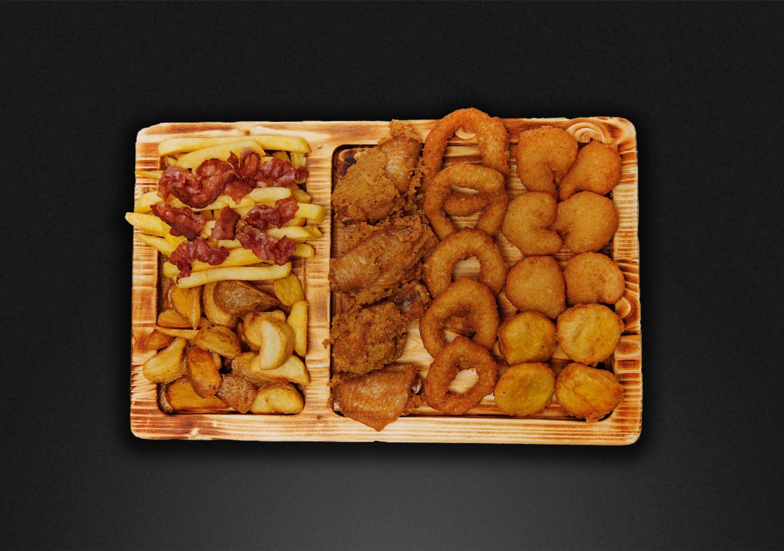 Острые куриные крылышки, Кольца кальмара, Креветки в кляре, Наггетсы, Картофель по-деревенски, Картофель фри с беконом, соус на выбор + 35 руб.