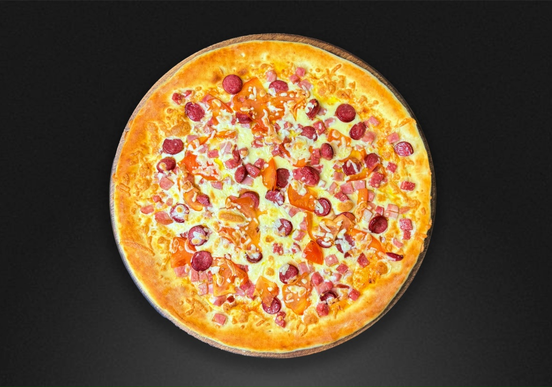 Соус (фирменный), колбаса п/к, ветчина, охот.колбаски., сыр, помидоры.