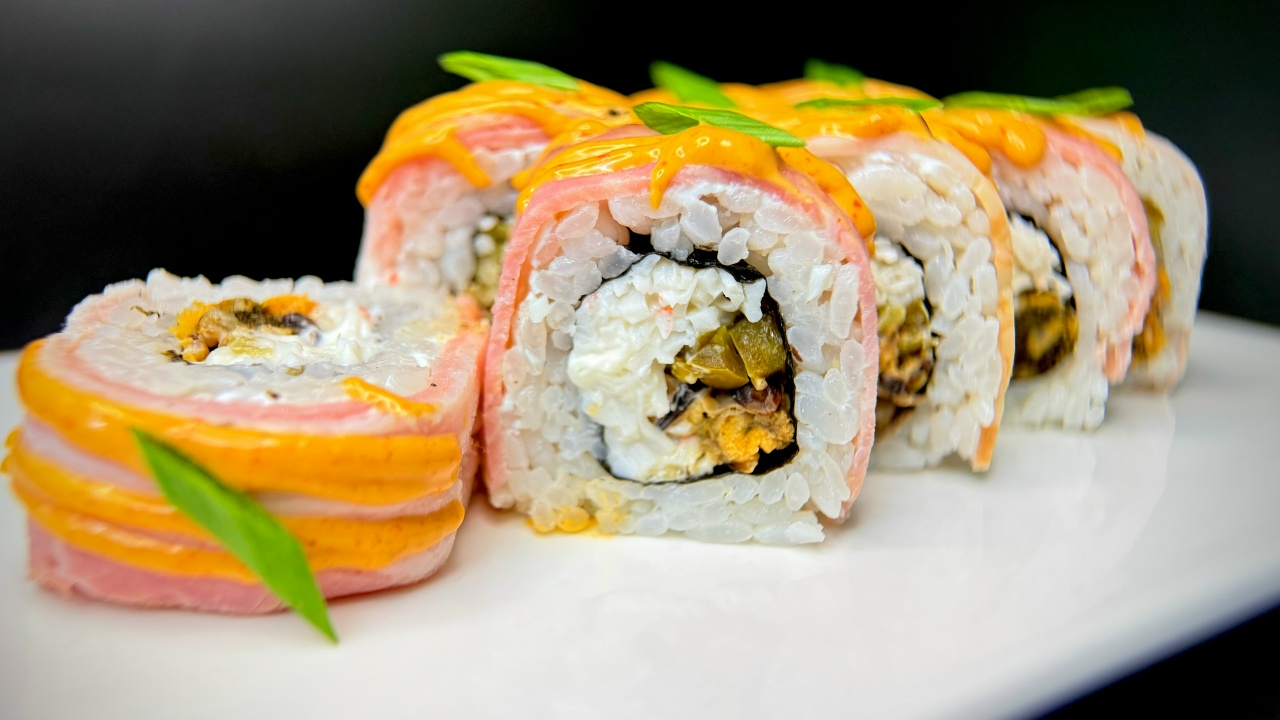 Бекон в/к, Снежный краб, Халапеньо, Мидии, Майонез, Сверху: соус спайси, лук зеленый.