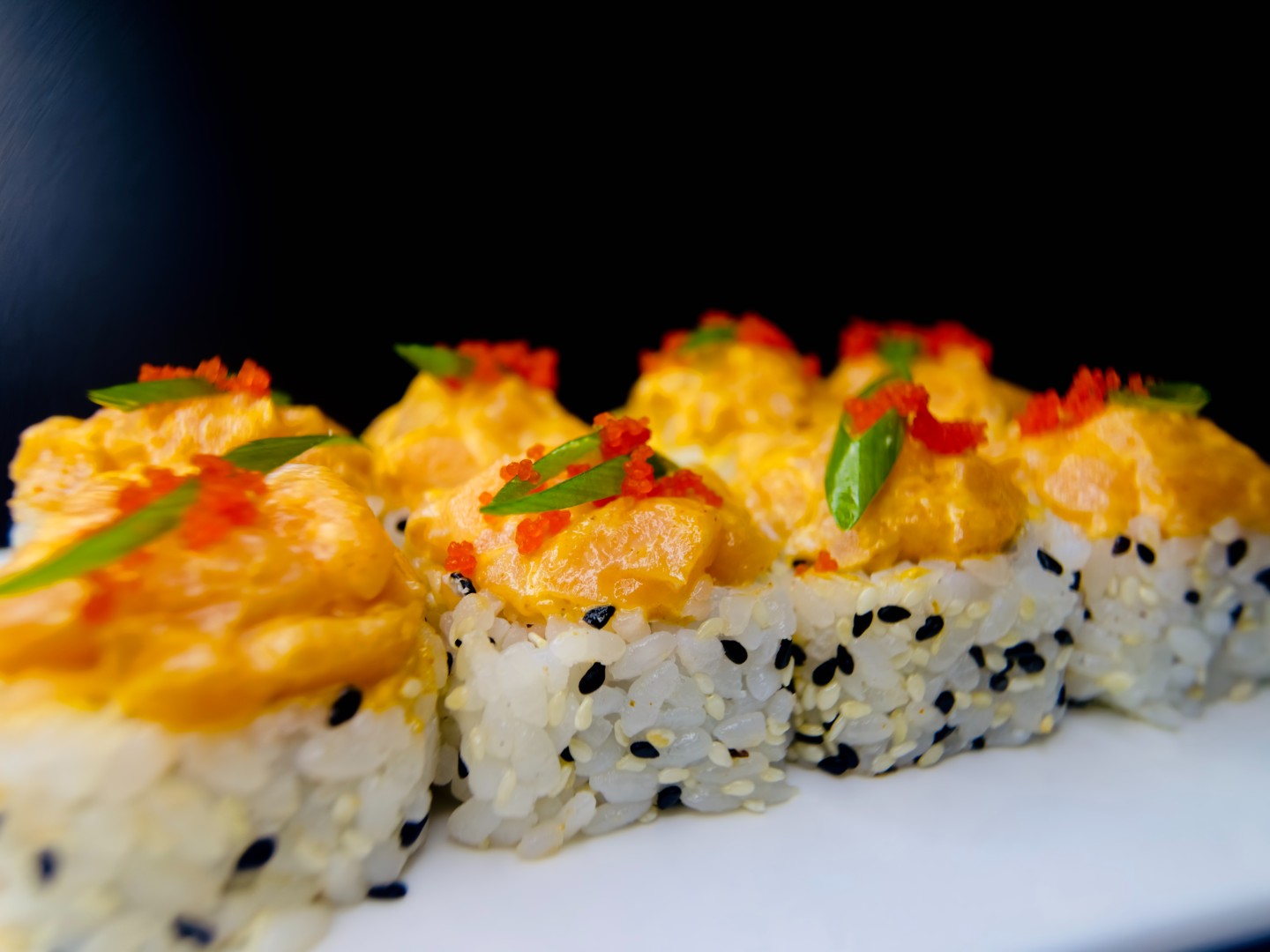 авокадо, огурец свежий, сыр творожный крем-чиз, кунжут, сверху: лосось охлажденный в остром соусе спайси, лук зеленый, икра масаго. вес: 235 грамм