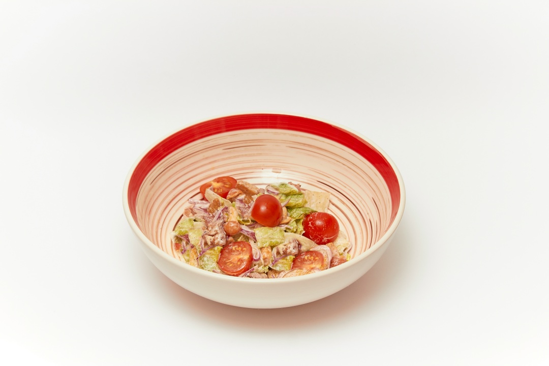 Салат листовой, помидоры, бекон, картофель по-деревенски, опята маринованные, лук красный, чесночный соус.