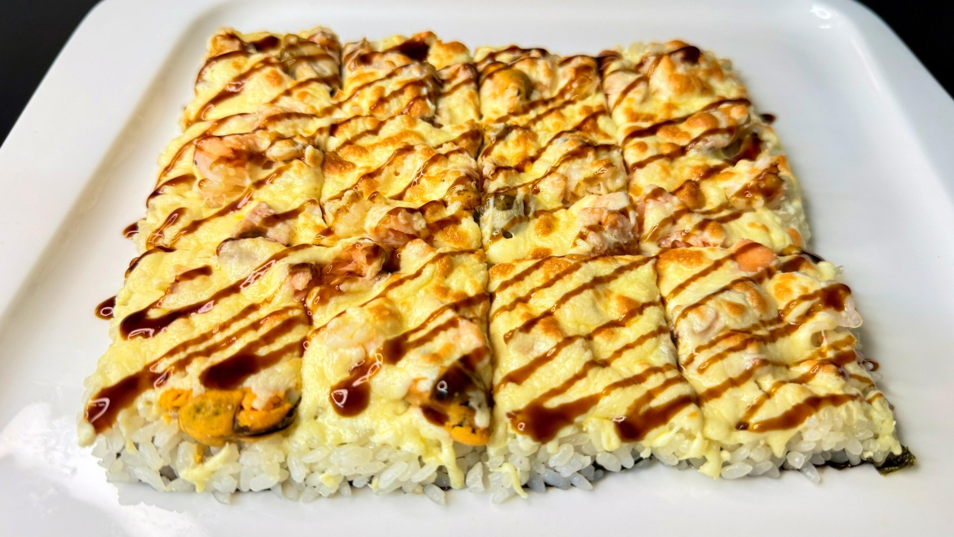 Нори, рис, мидии, креветка, лосось, сыр творожный, сыр моцарелла, соус унаги.