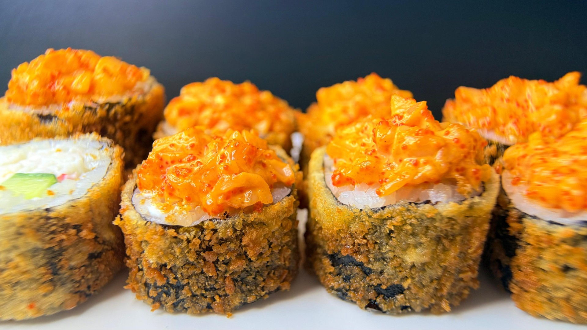 Снежный краб, сыр творожный крем-чиз, огурец свежий. Сверху: креветка тигровая, соус спайси, икра масаго, кляр, панировочные сухари.