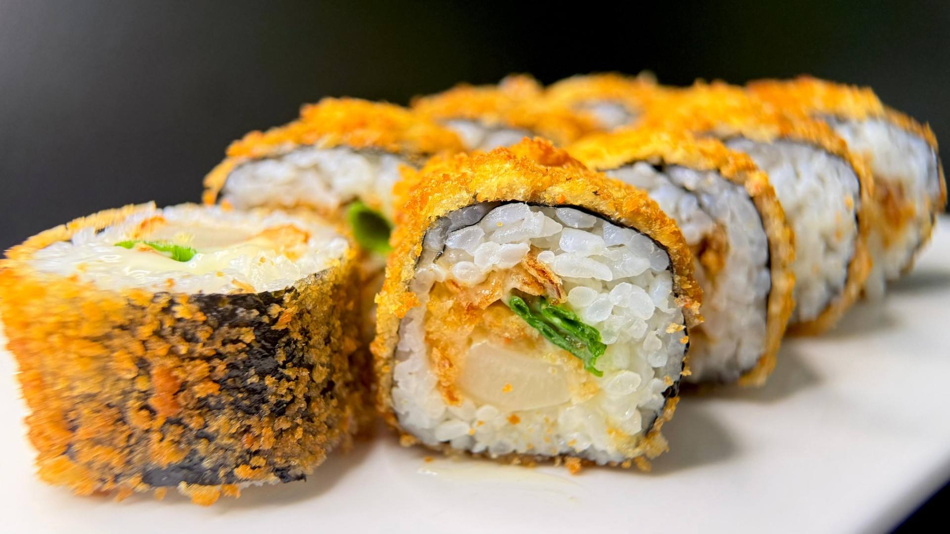Кальмар в кляре, сыр сливочный, лук фри, лук зеленый. Сверху: кляр, панировочные сухари