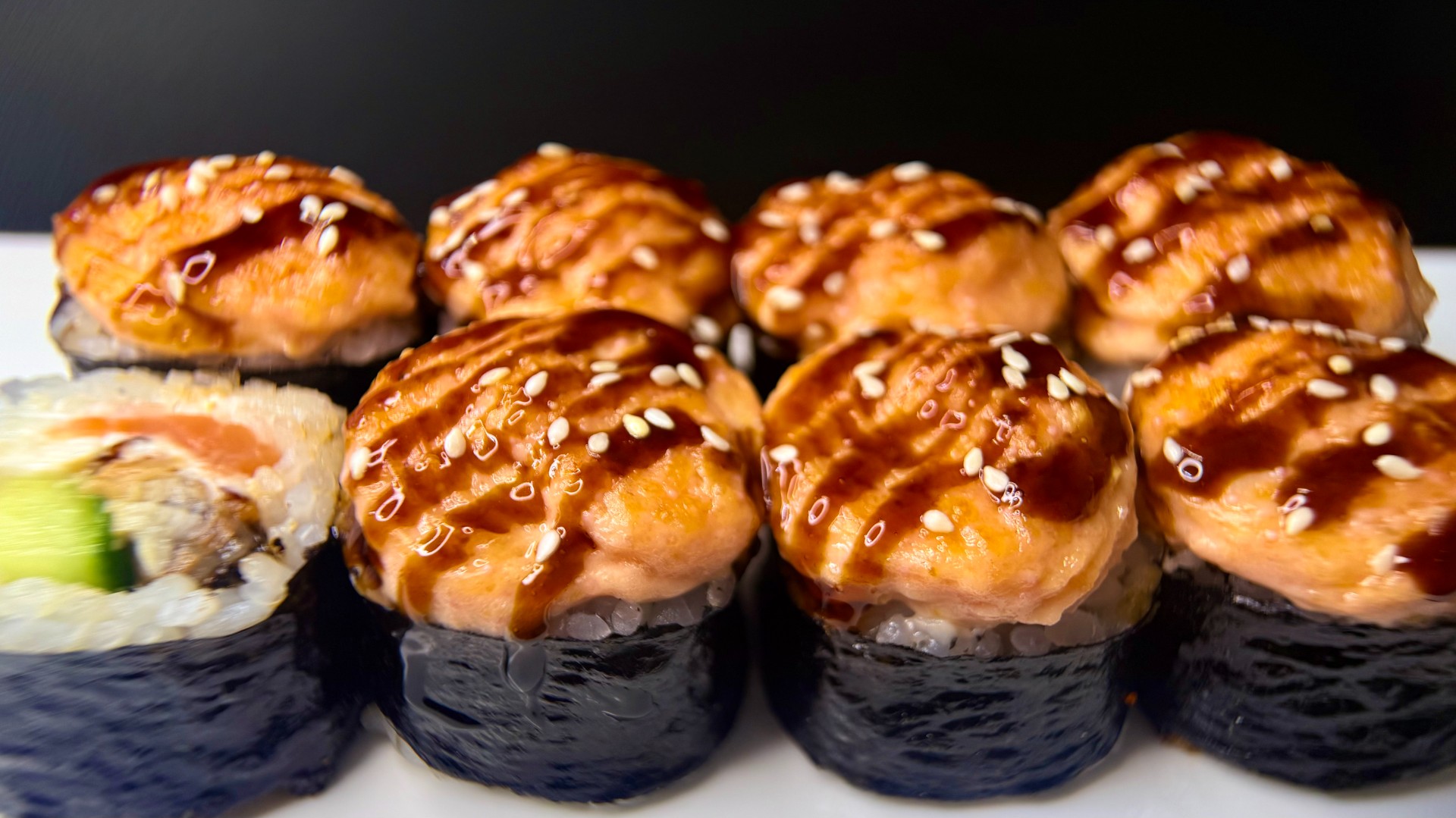 лосось охлажденный, угорь жареный, сыр творожный крем-чиз, огурец свежий, кунжут, сверху: замес фирменный. 264 гр.