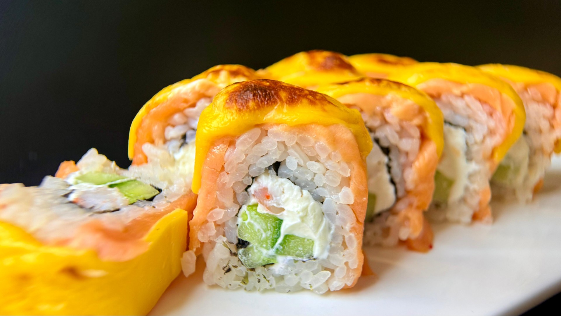Лосось охлажденный, креветка тигровая, сыр творожный крем-чиз, огурец свежий, сыр чеддер. вес: 260 гр.