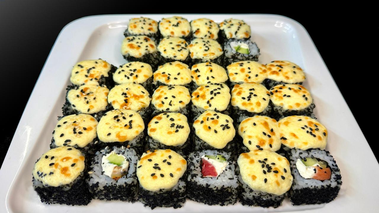 Запеченный с лососем (лосось охлажденный, сыр творожный, свежий огурец, сырная шапочка), Запеченный с угрем (угорь жареный, сыр творожный, свежий огурец, сырная шапочка), Запеченный с тунцом (тунец охлажденный, сыр творожный, свежий огурец, сырная шапочка), Запеченный со снежным крабом (снежный краб, сыр творожный, свежий огурец, сырная шапочка), 32 шт