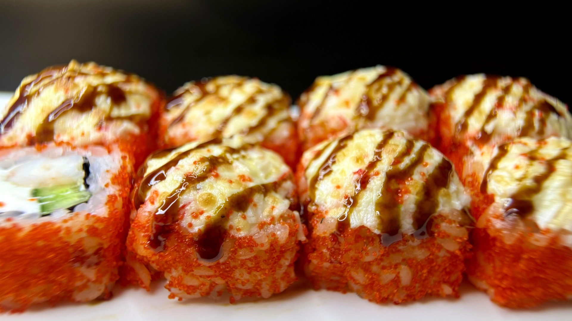 Креветка тигровая, сыр творожный крем-чиз, огурец свежий, икра масаго, сверху: шапочка снежный краб, соус унаги. вес: 280 гр.