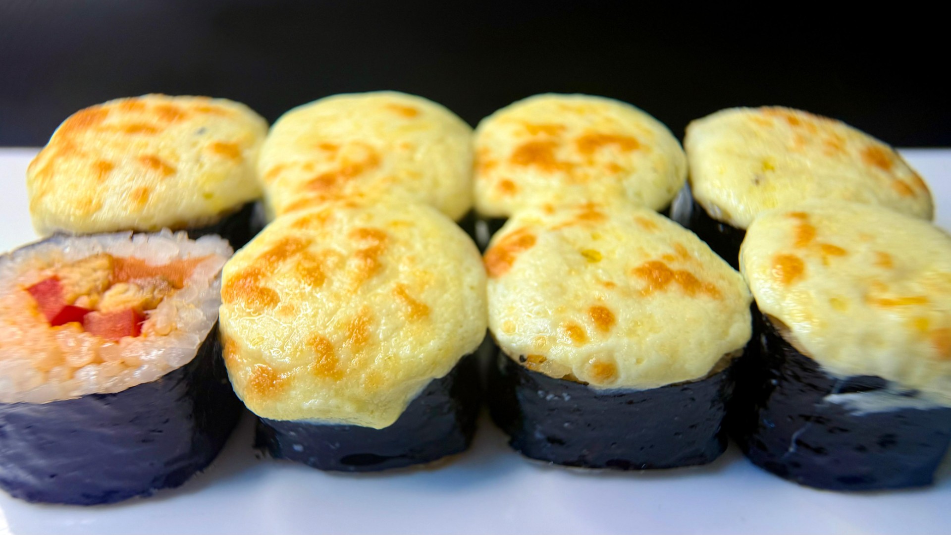 Лосось охлажденный, угорь жареный, перец болгарский, соус спайси.Сверху: сырная шапочка.